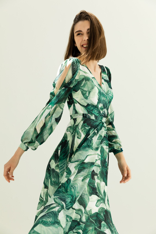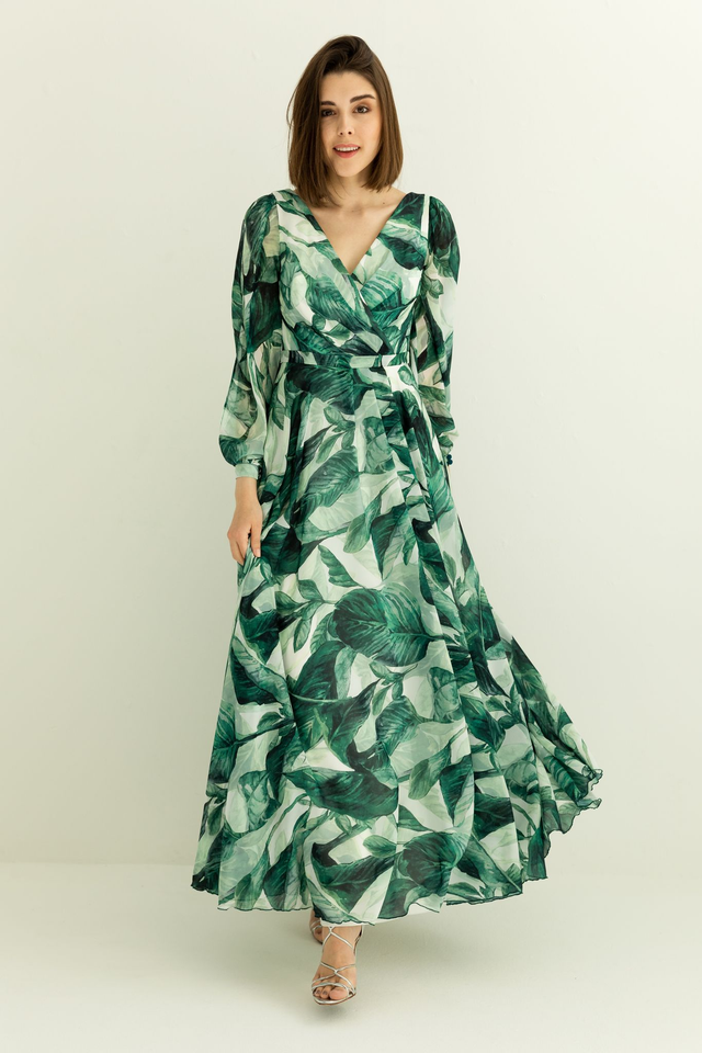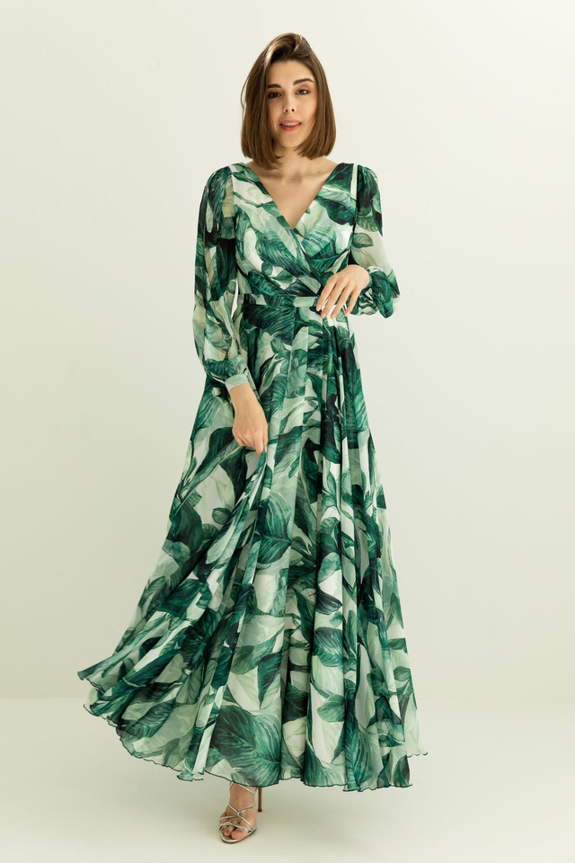 Aufregendes Maxikleid mit Schlitz aus leichtem Chiffon und modernen Blätterprint. Das Kleid hat geschlitze Ärmel, sowie vorne und hinten einen V-Ausschnitt.