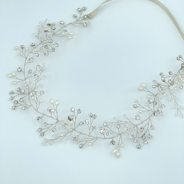 Brauthaarband in silber mit vielen feinen Details in Glasoptik, Perlen und Glitzer. Ein Hauch von Nostalgie für deine Brautfrisur.