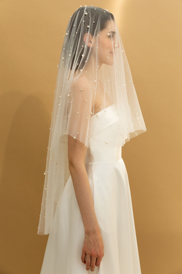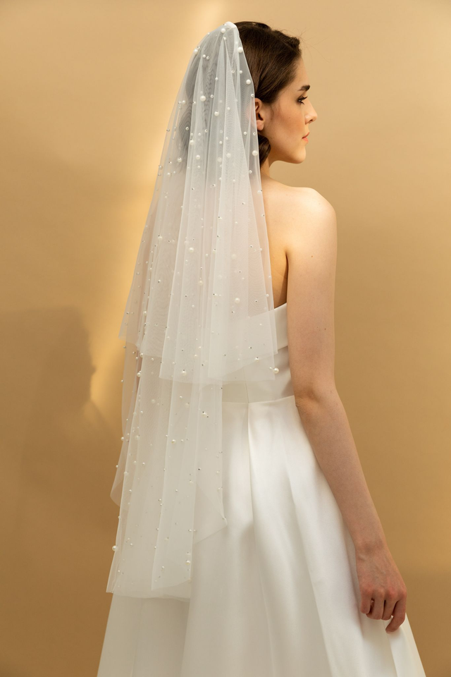 Bezaubernder Schleier mit unzähligen kleinen und grossen Perlen bestickt. Der Schleier ist hüftlang und doppellagig, sodass er doppelt nach hinten und auch nach vorne über das Gesicht getragen werden kann.