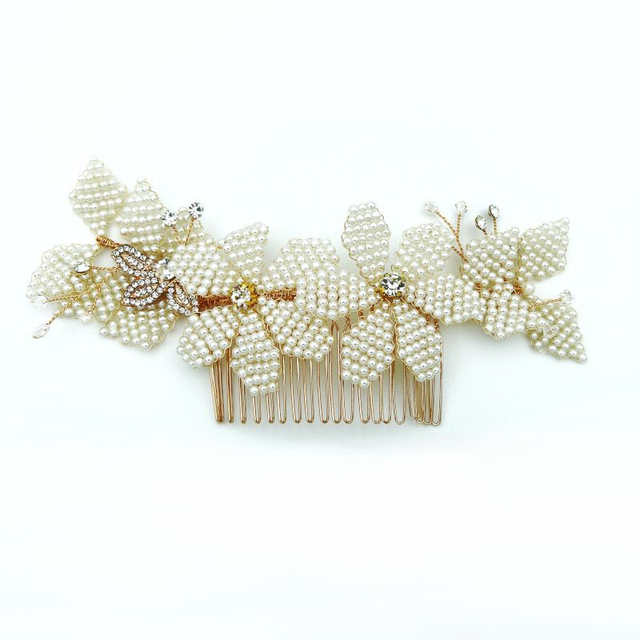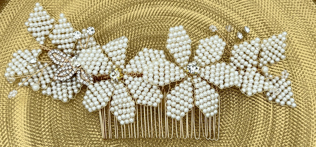 Wunderschöner Brauthaarkamm aus kleinen Perlen und Strass, die durch einen goldenen Draht zu Blümen geformt werden