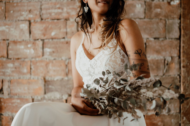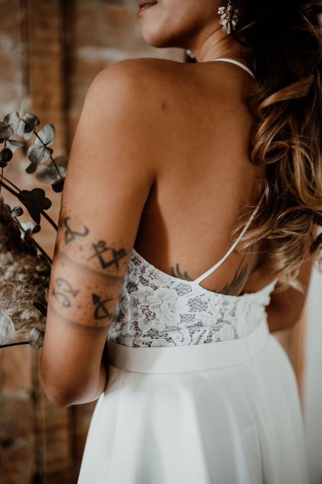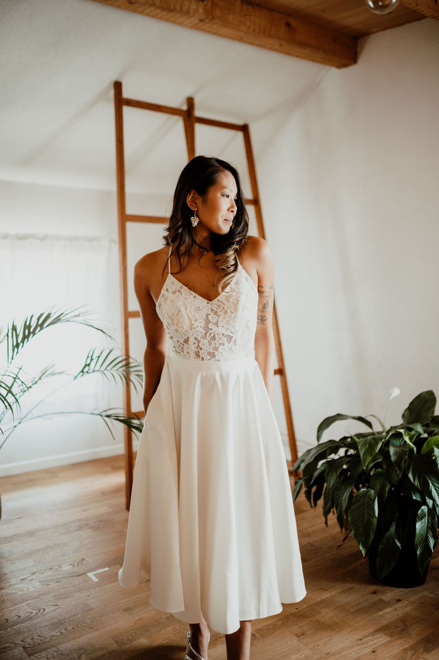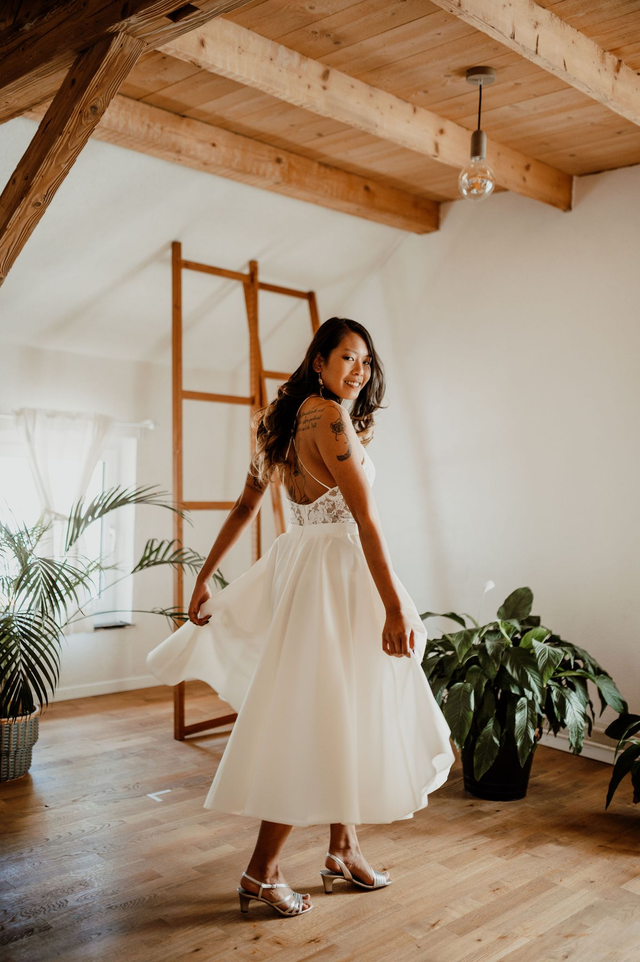 Sommerliches kurzes Brautkleid mit fliessendem Satinrock und Spitzenoberteil. Die feinen Spaghettiträger sind auf dem tiefen Rückenausschnitt überkreuzt und dasSpitzenoberteil ist mit einem feinen Blushton unterlegt. So schmiegt es sich wunderbar an deine Haut an.