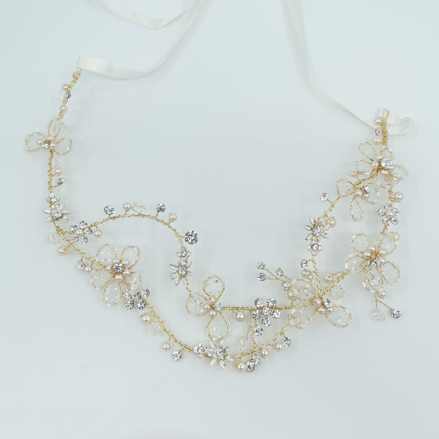 Zauberhaftes asymetrisches Haarband aus goldenen Blumen und feinen Glasperlen.